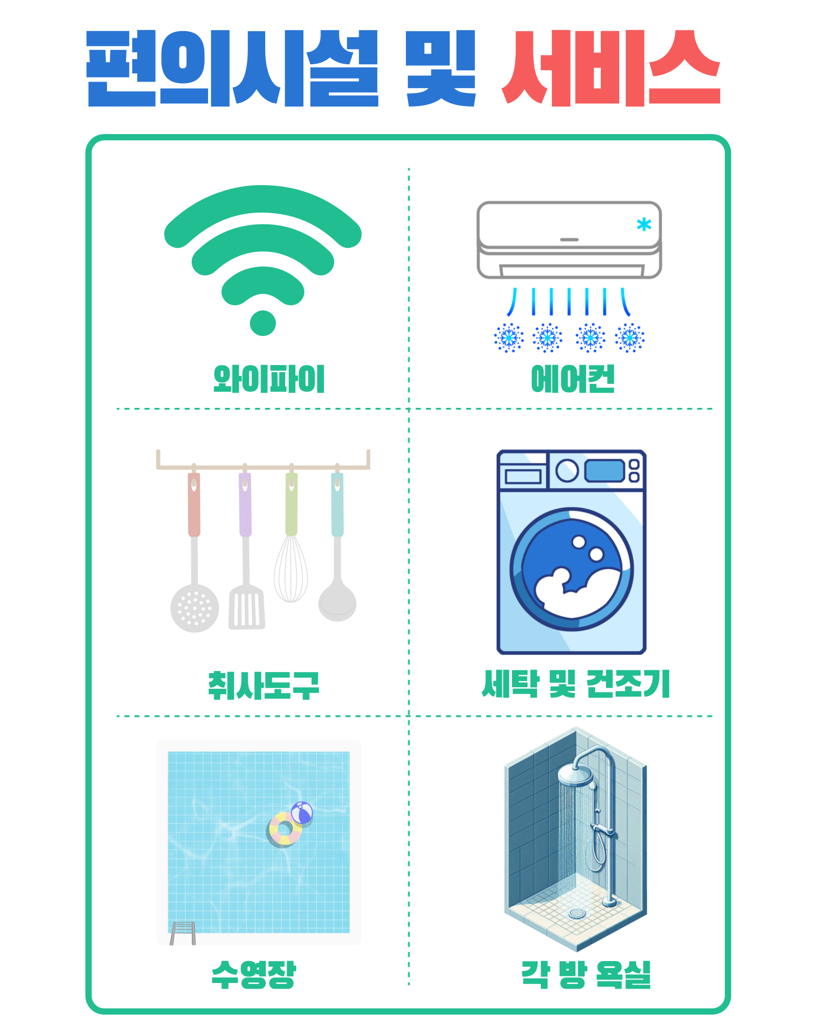 | 수영장 | 와이파이 | 개인 단독형 독채 객실 | 각 방 화장실,샤워실 완비 |